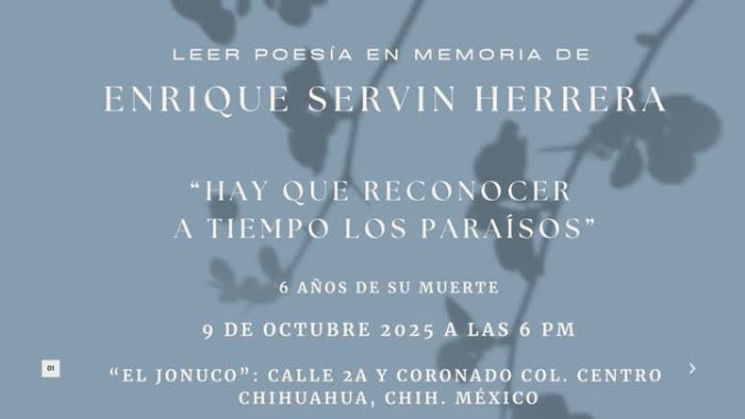 Comparte esto: Haz clic para compartir en X (Se abre en una ventana nueva) X Haz clic para compartir en Facebook (Se abre en una ventana nueva) Facebook Me gusta Cargando... Relacionado Leer poesía en memoria de Enrique Servín Herrera 7 de octubre, 2025 / Enrique Servín Asociación Civil / Deja un comentario